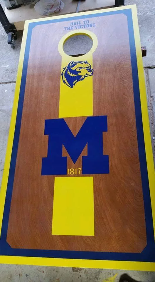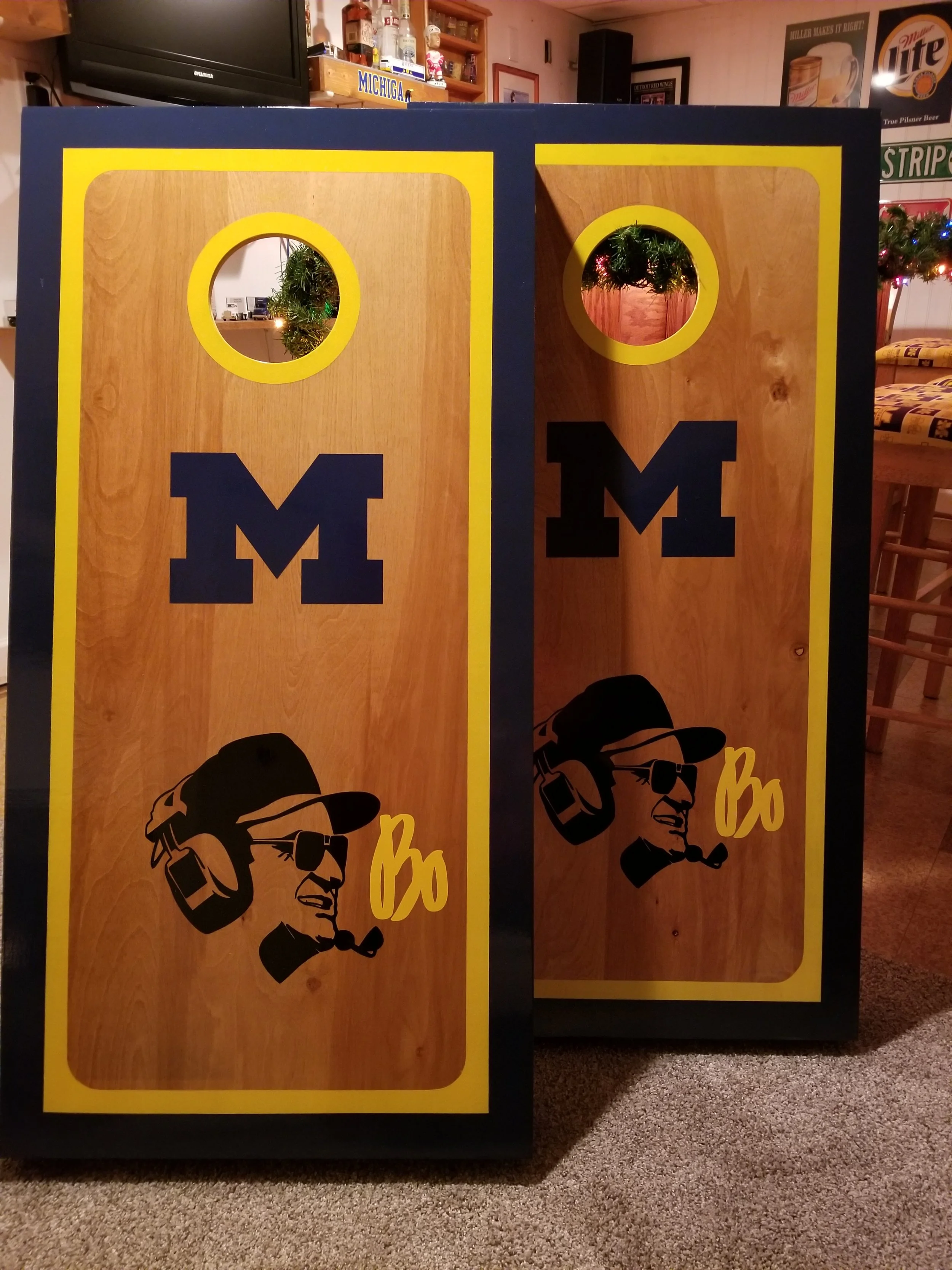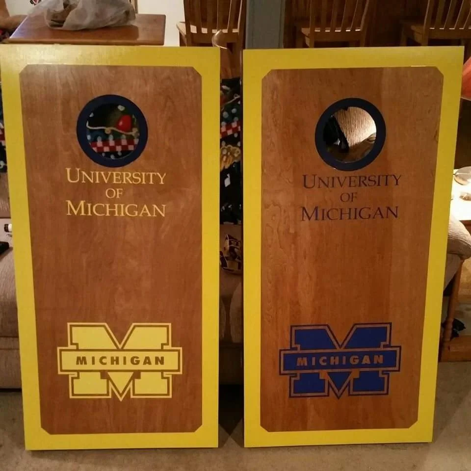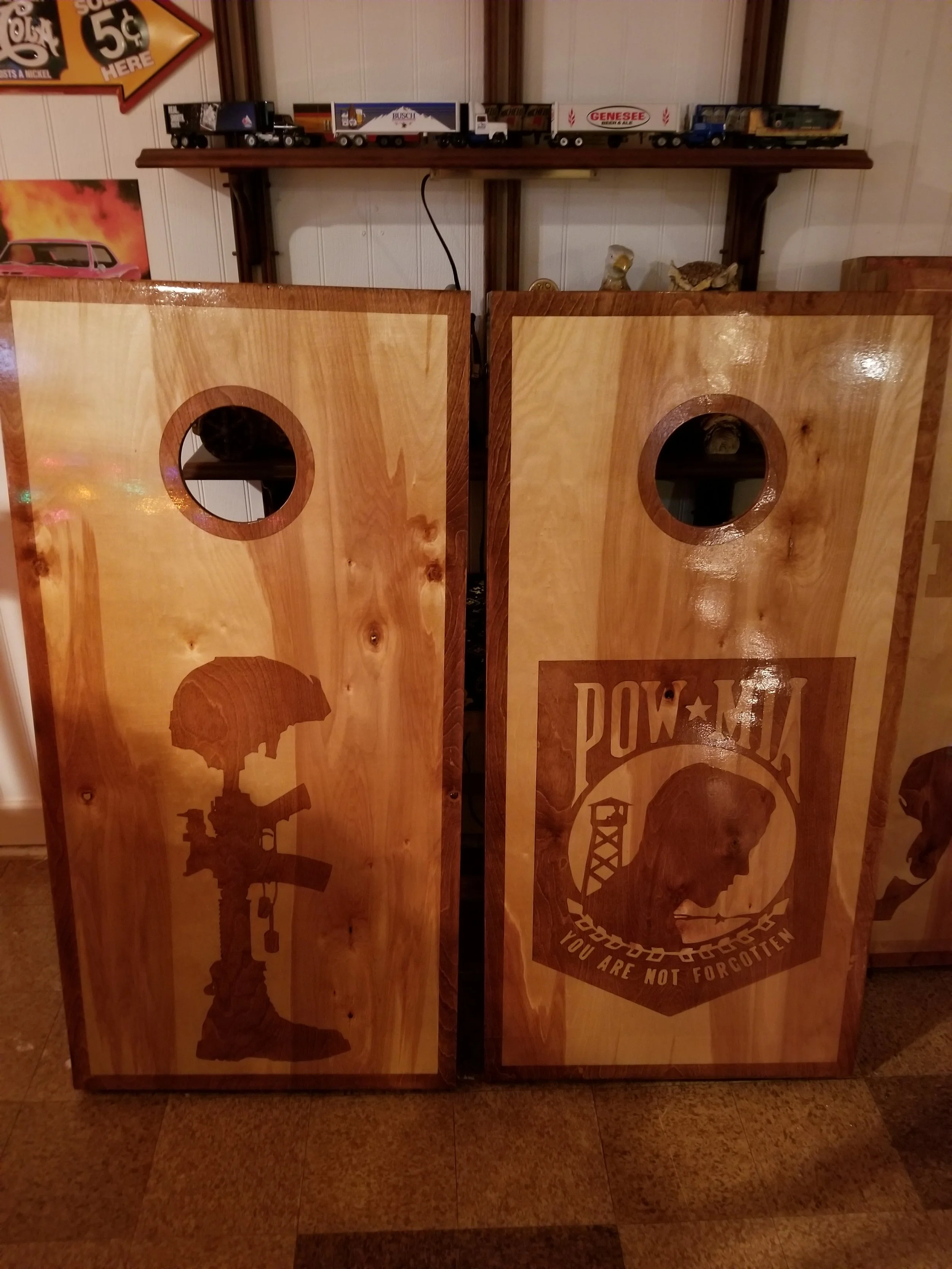 JBM Woodworking offers custom cornhole boards. Boards can be designed based on the customer’s idea. Boards typically have a 2 week turn around (depending on complexity of design) and requires a non-refundable deposit of $100.00. Boards typically run $250.00 for a set and include a set of bags your choice of color.